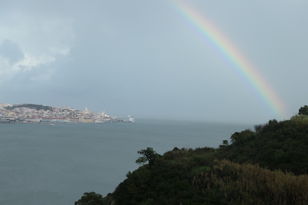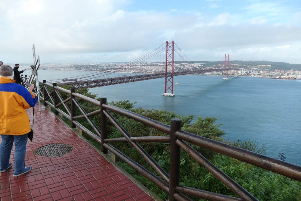 Über die Ponte 25 de Abril überquerten wir den Tejo und erreichten so die Christusfigur Cristo Rei. Hatte es in Strömen geregnet und wild gestürmt, als wir das Schiff verließen, so ließen sich jetzt doch einige Sonnenstrahlen entdecken. Der Wind war nach wie vor heftig.